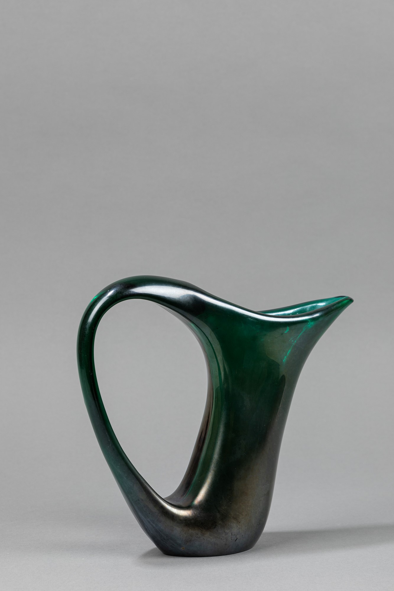 della serie Anse volanti in vetro verde iridato con lungo becco e grande ansa ricavata forando la parete stessa del vaso.
