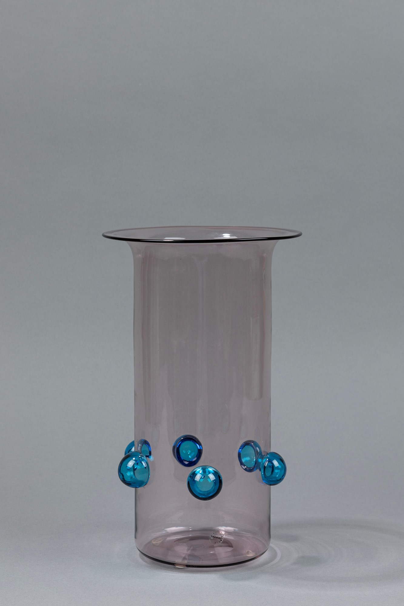 Produzione Salviati. Etichetta originale. Firma a punta Salviati.Cilindrico in vetro soffiato trasparente con bolle color acquamarina.