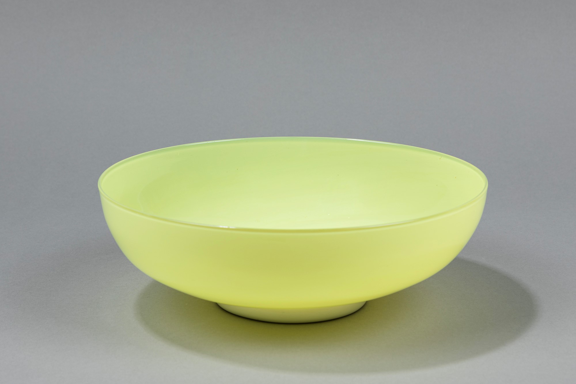 Firma ad acido Venini Murano Italia. Produzione Venini.della serie Anni Trenta color limone con base in vetro lattimo. Modello 3420.