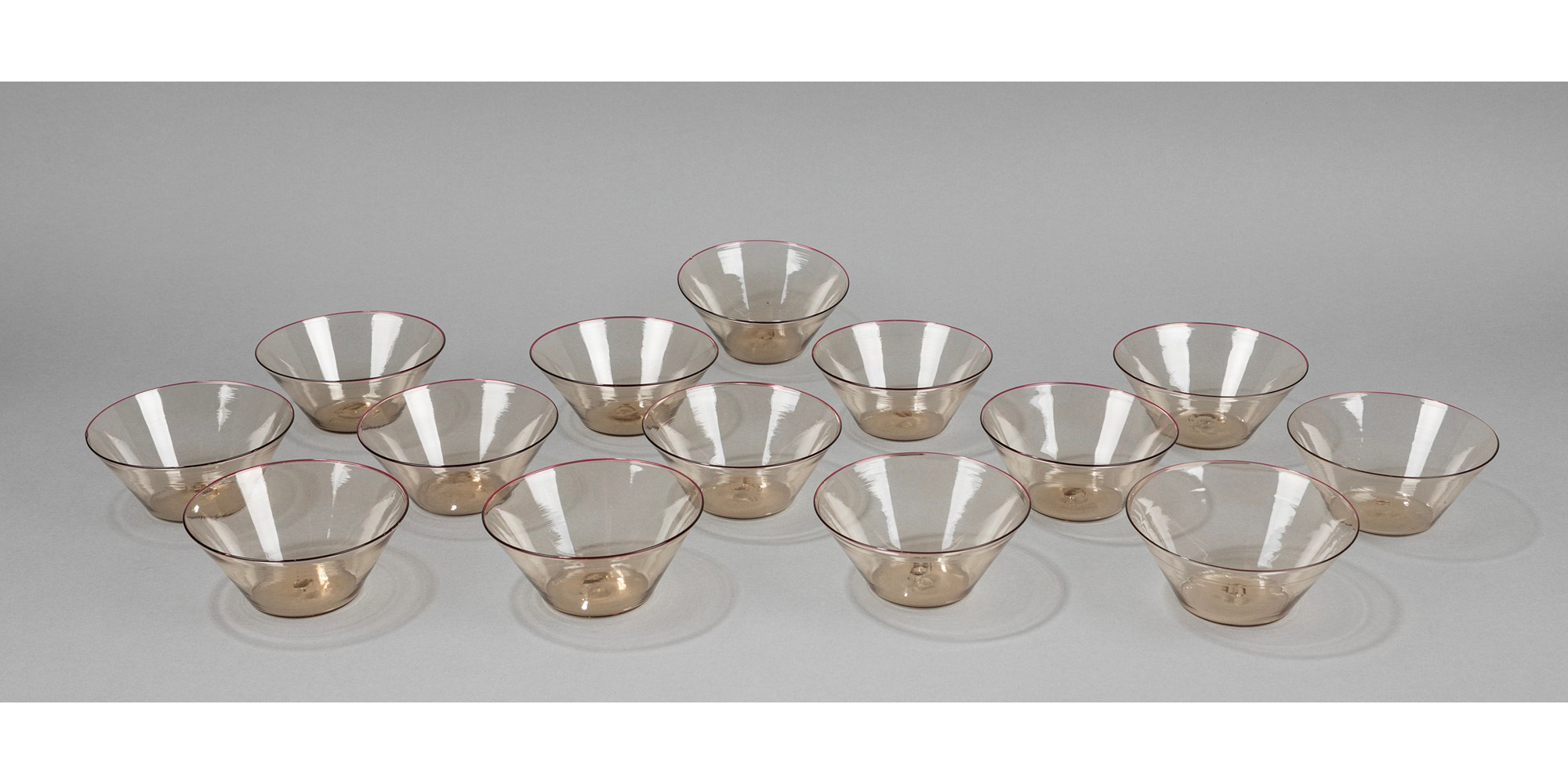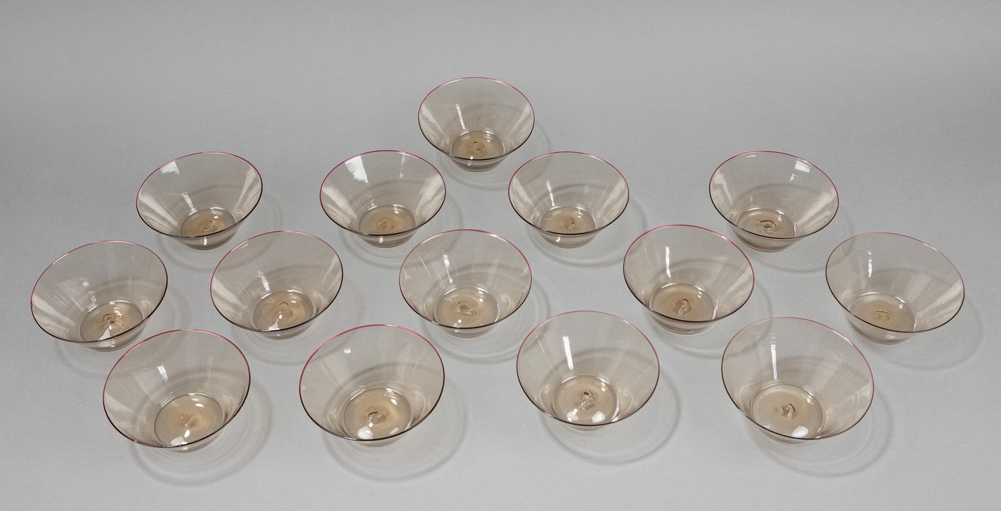 Produzione Cappellin. Firma ad acido MVM Cappellin.composto da 12 coppe in vetro soffiato con bordo ametista.