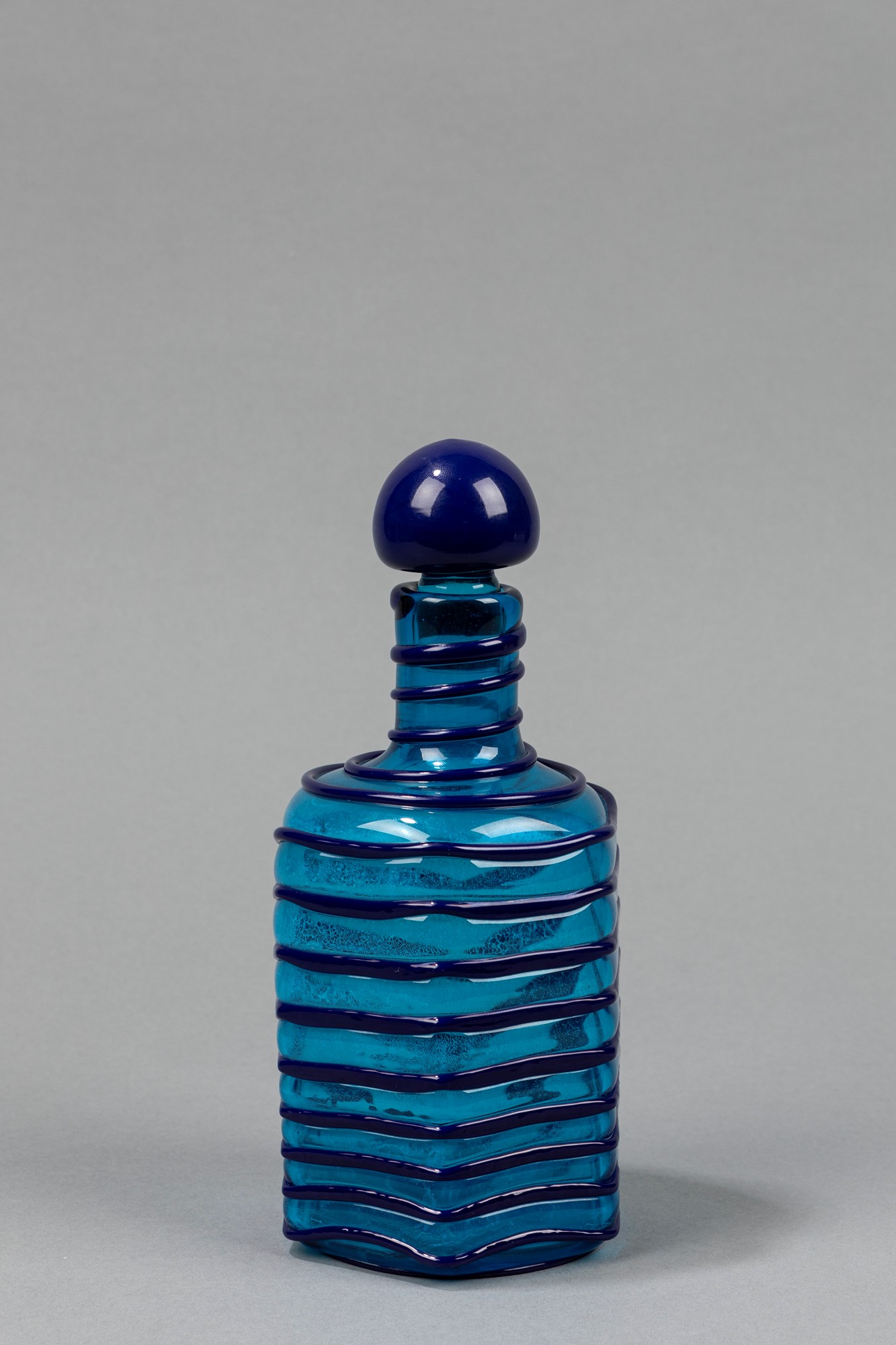 con tappoin vetro trasparente con decoro a fili in pasta di vetro color blu intenso.
