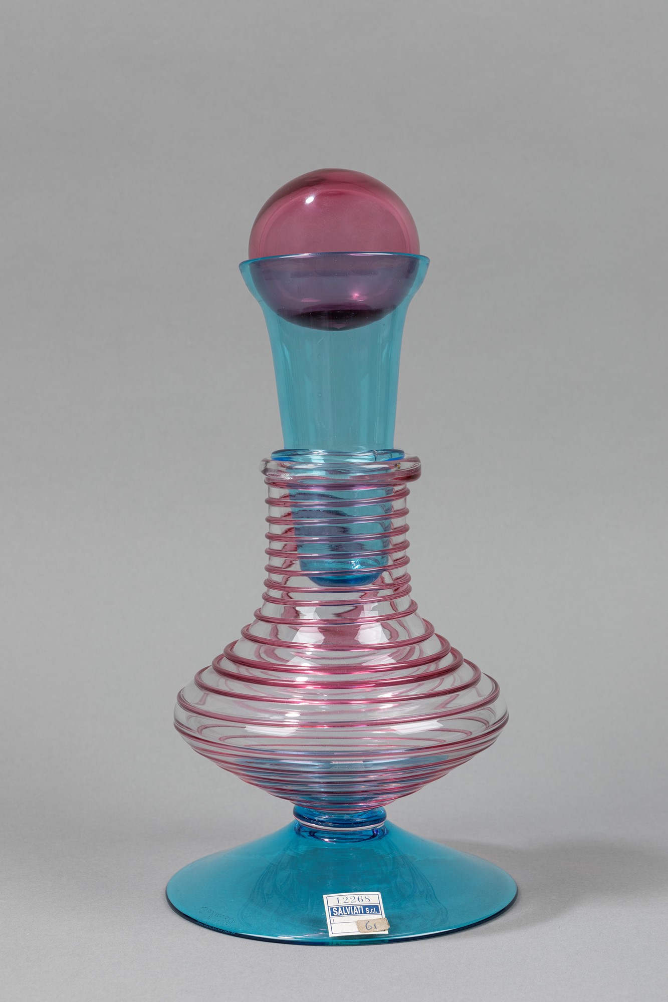 Produzione Salviati. Etichetta originale. Firma a punta.Con tappo e con il suo bicchiere nei colori del rosa e dell’azzurro. Vetro soffiato di Murano.