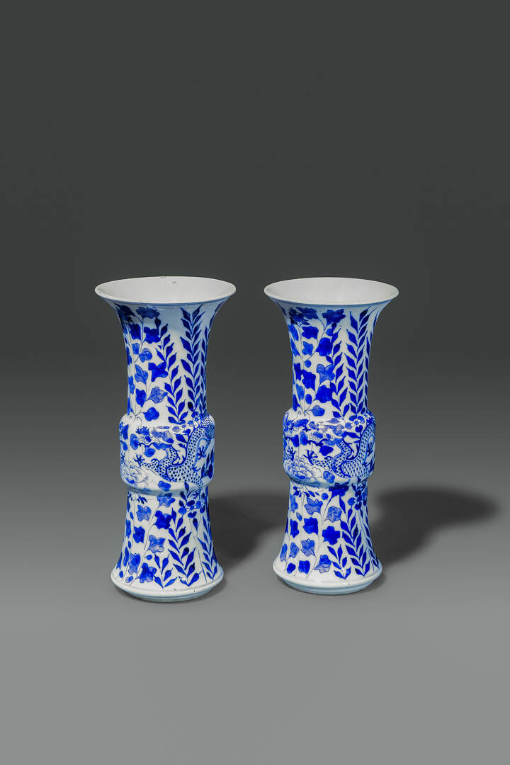 Coppia di vasi a tromba in porcellana bianco e blu, dipinti con draghi e fiori, Cina, dinastia Qing, XVIII sec