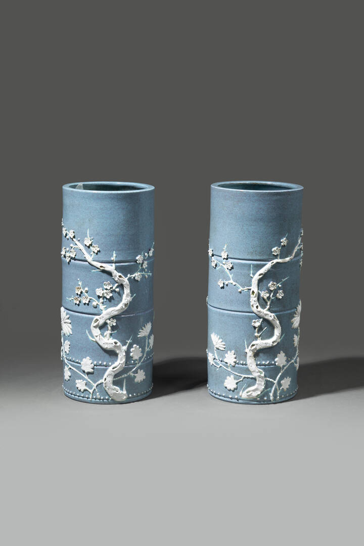 Coppia di vasi cilindrici con decoro naturalistico nei toni del bianco sul fondo blu, Cina, dinastia Qing, XIX sec