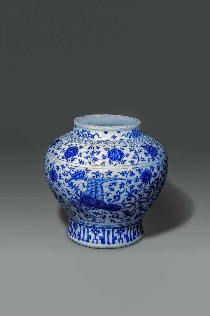 Vaso in porcellana bianco e blu, dipinto con fenici e decori floreali, Cina, dinastia Qing, XIX sec