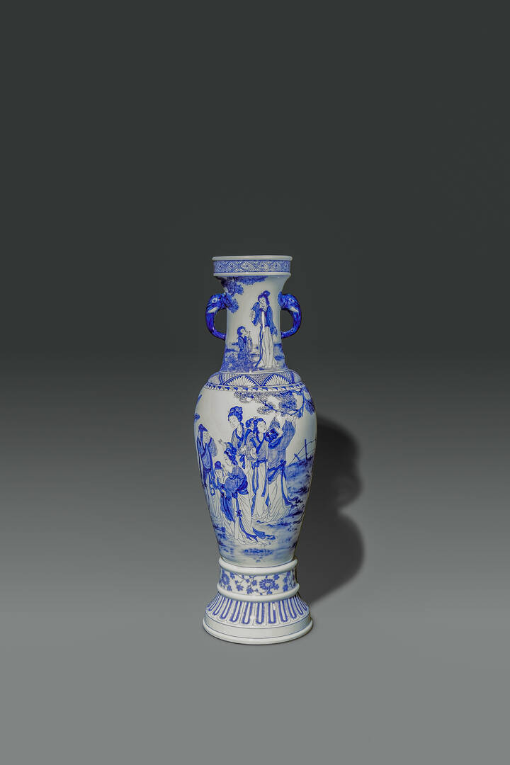 Vaso in porcellana bianco e blu dipinto con Guanyin e manici a rilievo a forma di elefanti, Cina, dinastia Qing, XIX sec