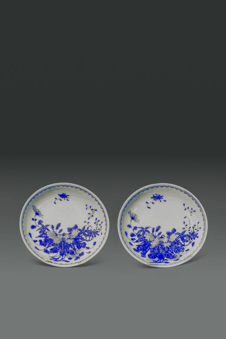 Coppia di piccoli piatti in porcellana bianca e blu con decori floreali, Cina, dinastia Qing, marca e del periodo Guangxu (1875-1908)