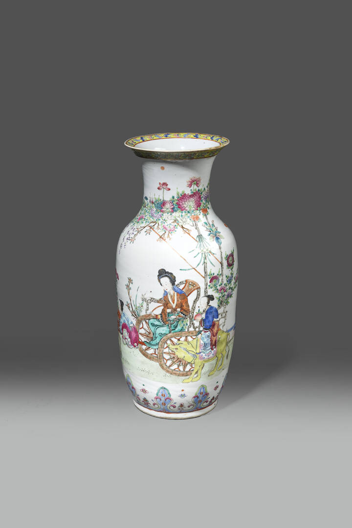 Vaso in porcellana Famiglia Rosa con figure di fanciulle entro paesaggio e decori floreali, Cina, dinastia Qing, XIX sec
