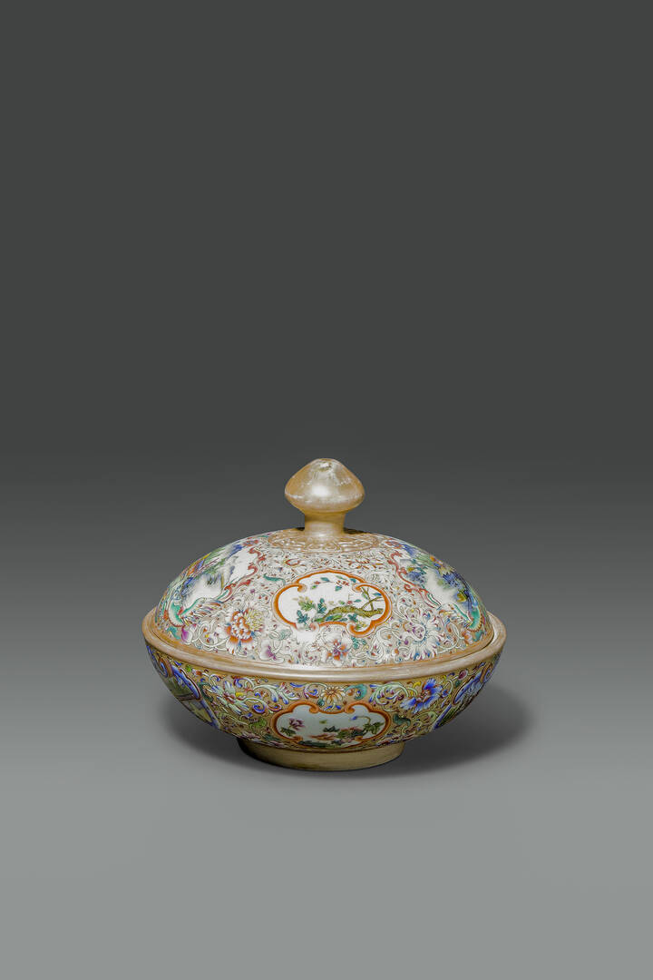 Portavivande in porcellana Famiglia Rosa decorata con fiori e paesaggi entro riserve, Cina, XX sec