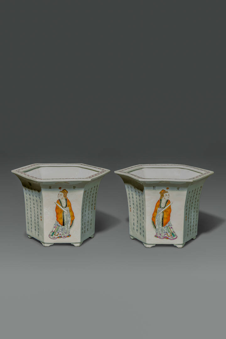 Coppia di fioriere in porcellana Famiglia Rosa, dipinte con iscrizioni e personaggi, Cina, Repubblica, XX sec