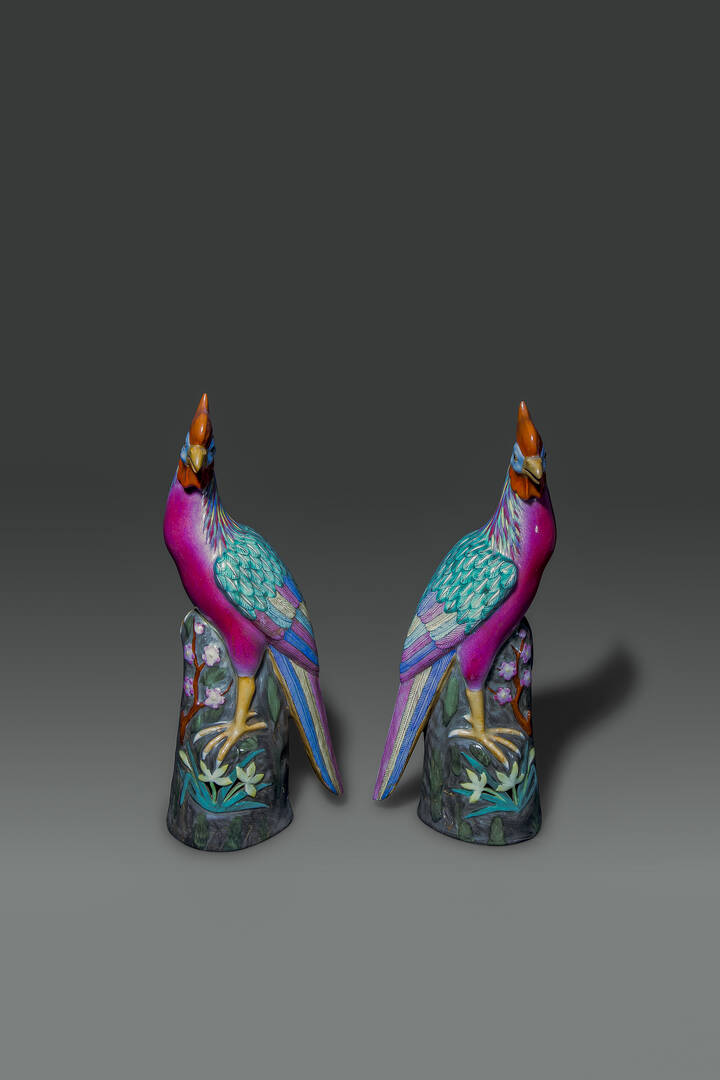 Coppia di galli in porcellana Famiglia Rosa, Cina Repubblica, XX Sec.