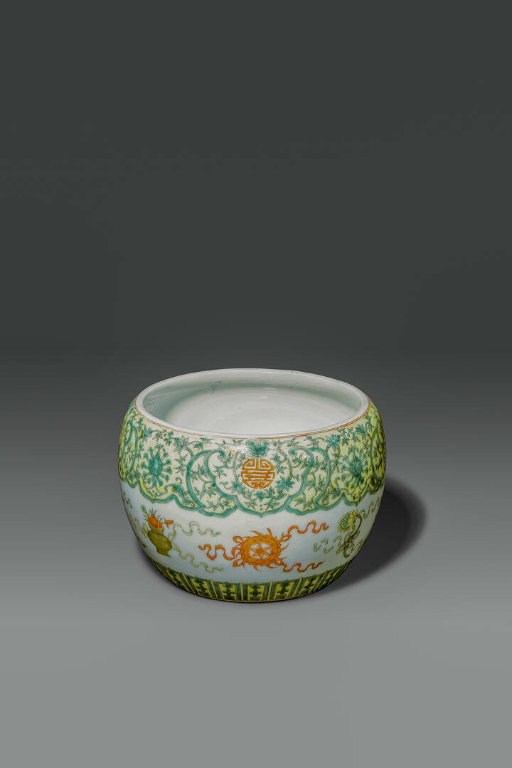 Piccola vasca in porcellana Famiglia Verde con decori di vasi fiori e pesci, Cina dinastia Qing, XIX sec