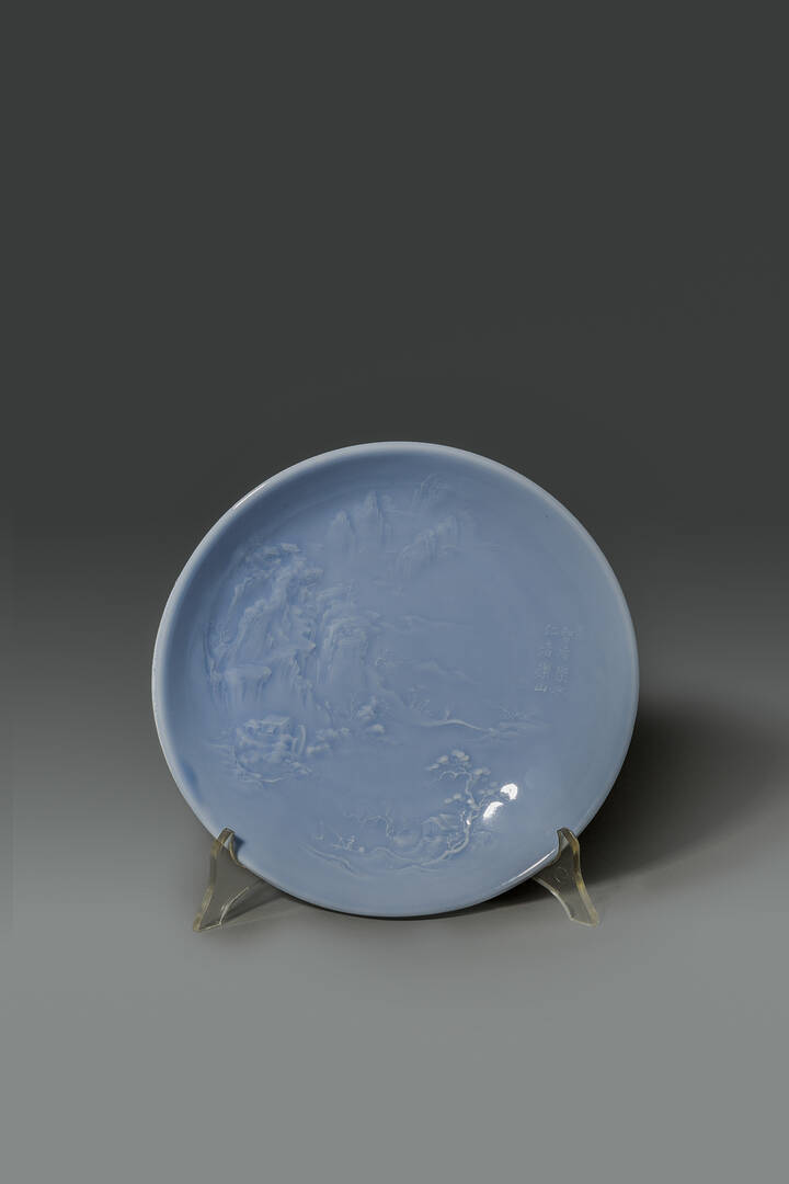 Piatto in porcellana claire de lune decorato con paesaggio a rilievo, Cina, Jingdezhen, XX sec (1960)