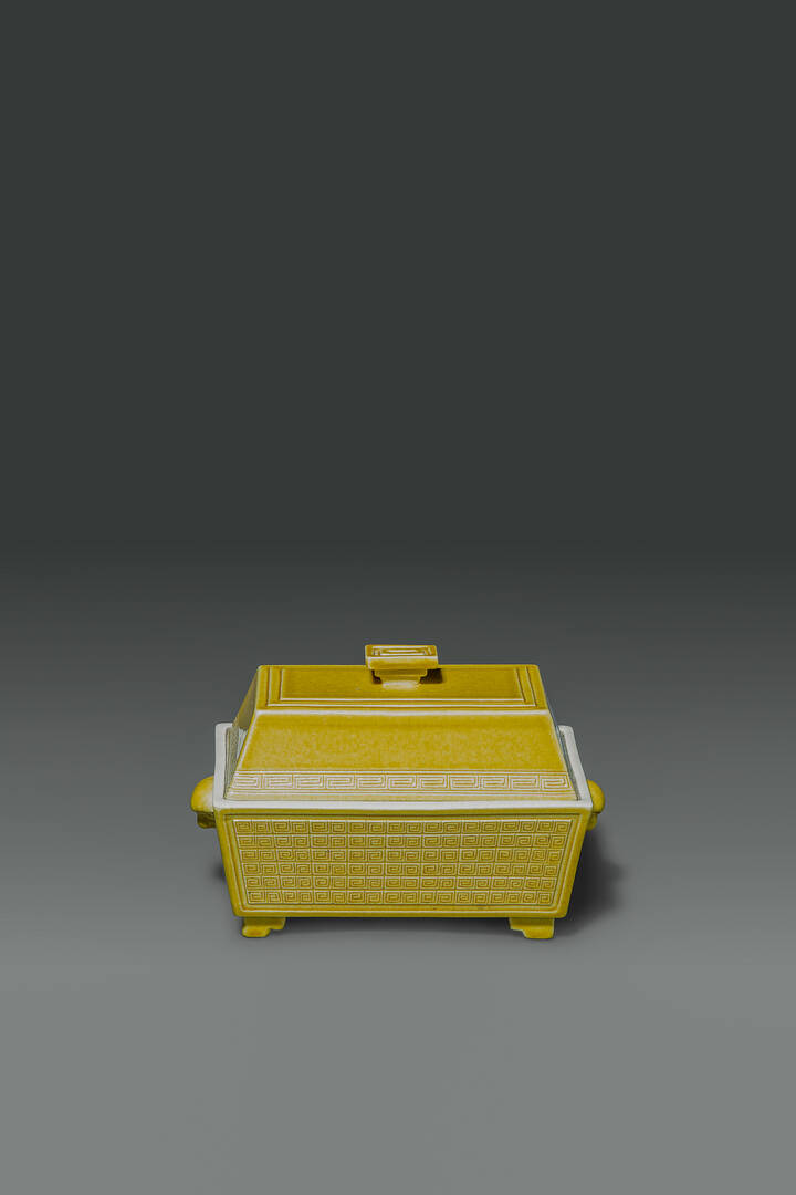Cofanetto in porcellana monocroma gialla con coperchio e manici zoomorfi, Cina,dinastia Qing, epoca Guangxu (1875-1908)