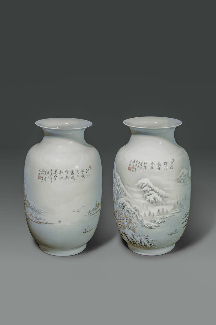 Coppia di vasi in porcellana con paesaggi invernali e iscrizioni, Cina, Repubblica, XX sec