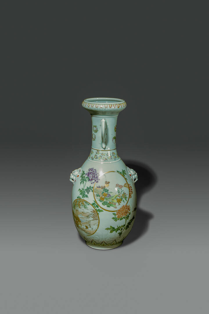 Vaso in porcellana Claire de Lune con lumeggiature oro, anse sagomate, mascheroni e figure di saggi, Cina, dinastia Qing, epoca Daoguang (1821-1850)