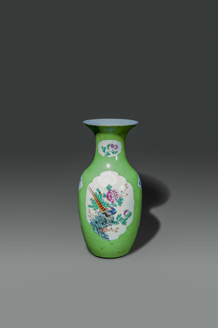 Vaso in porcellana su sfondo verde con dipinti di ucccelli e peonie entro riserve, Cina, Repubblica, XX sec