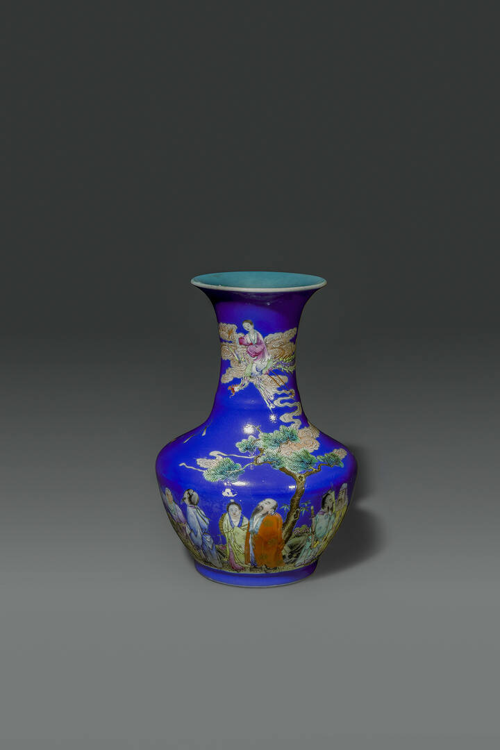 Vaso in porcellana di color blu cobalto con dipinti di vita quotidiana, Cina, dinastia Qing, XIX secolo