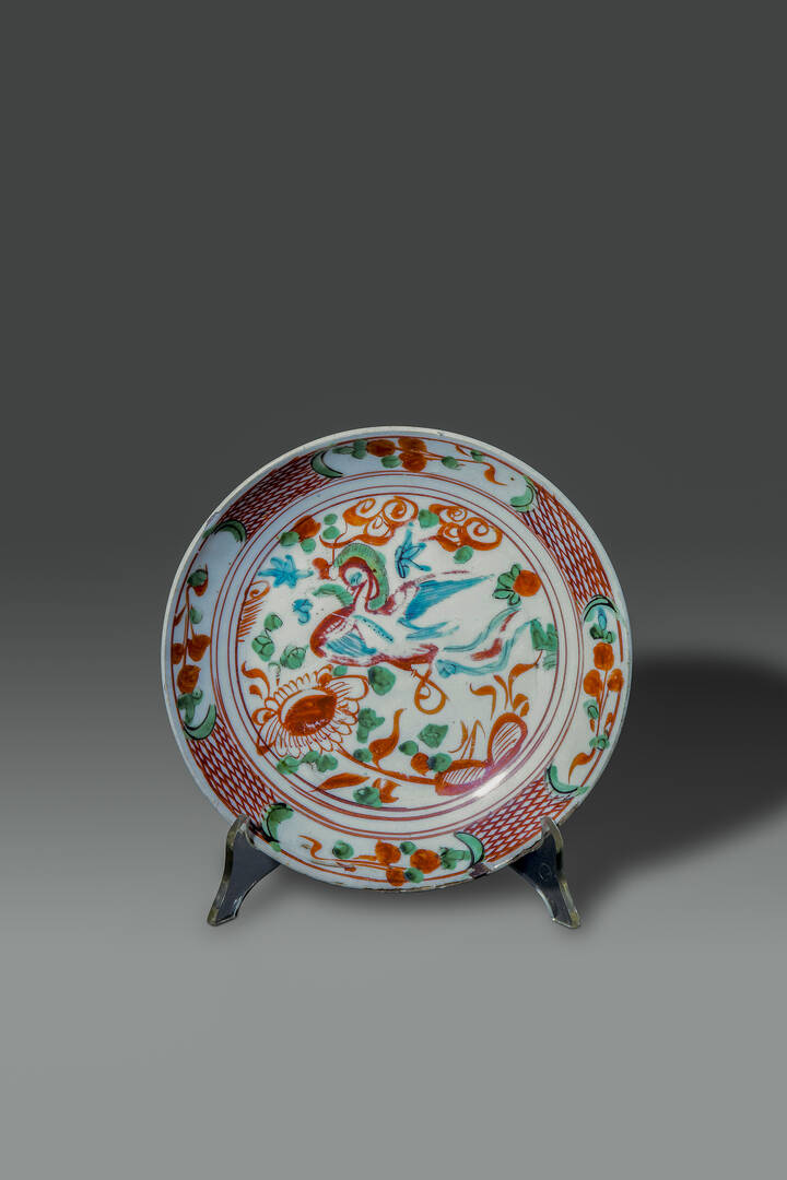 Piatto in porcellana Swatow con decori floreali nei toni del verde e del rosso, Cina, dinastia Ming, XVI sec