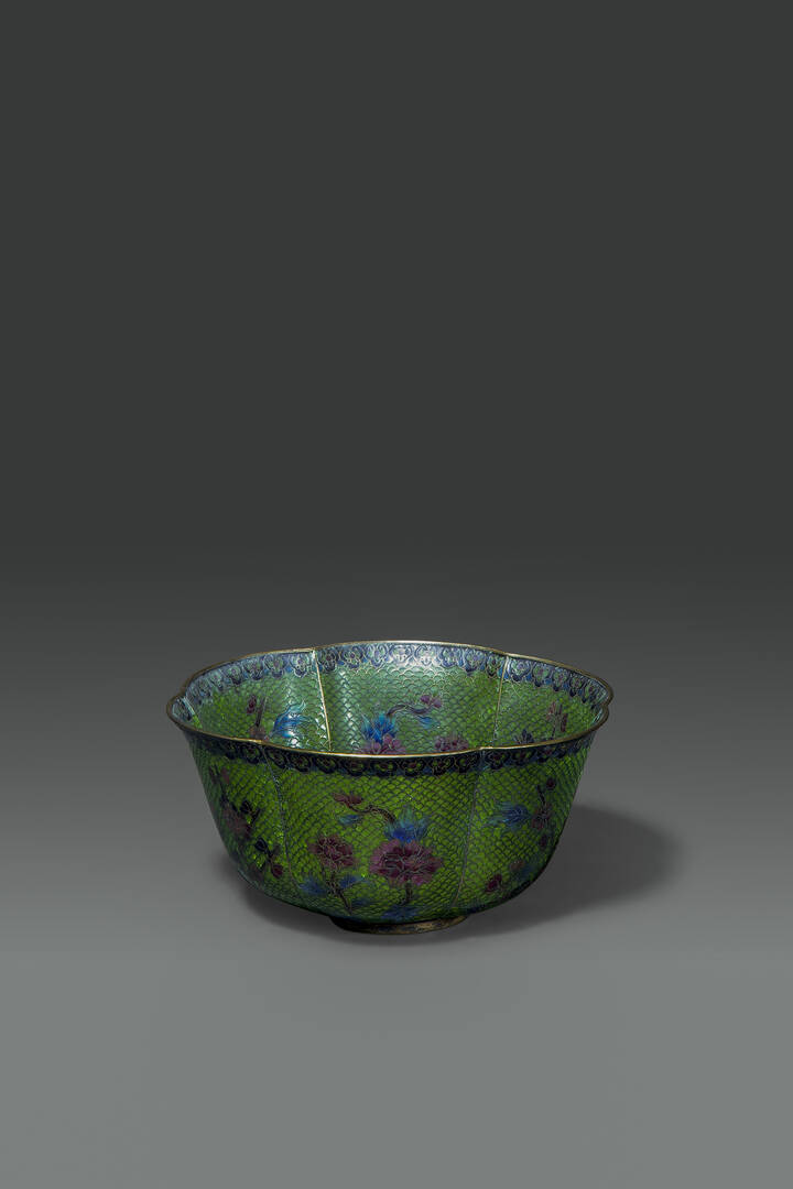 Ciotola in vetro con anima in rame con decori floreali, Cina, dinastia Qing, XIX secolo.
