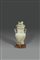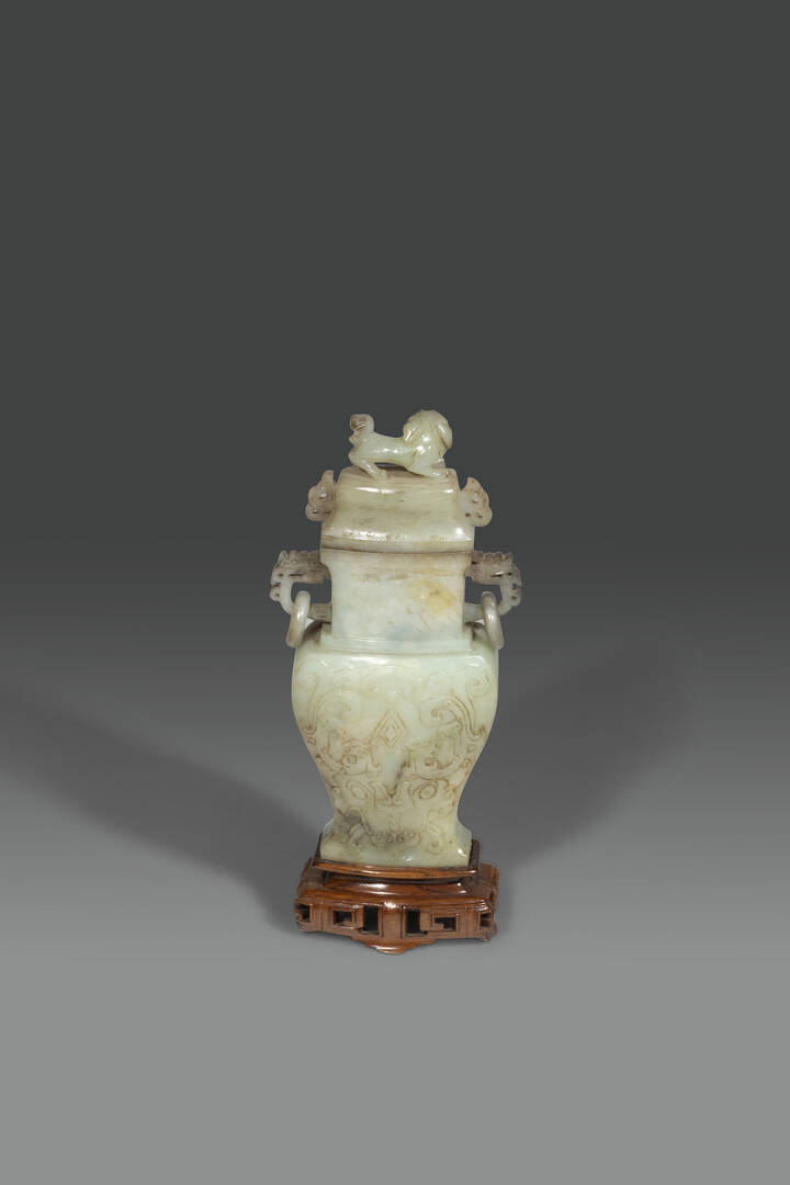 Vaso con coperchio sormontato da cane di Pho in giada celadon con russet, Cina, dinastia Qing, XIX sec