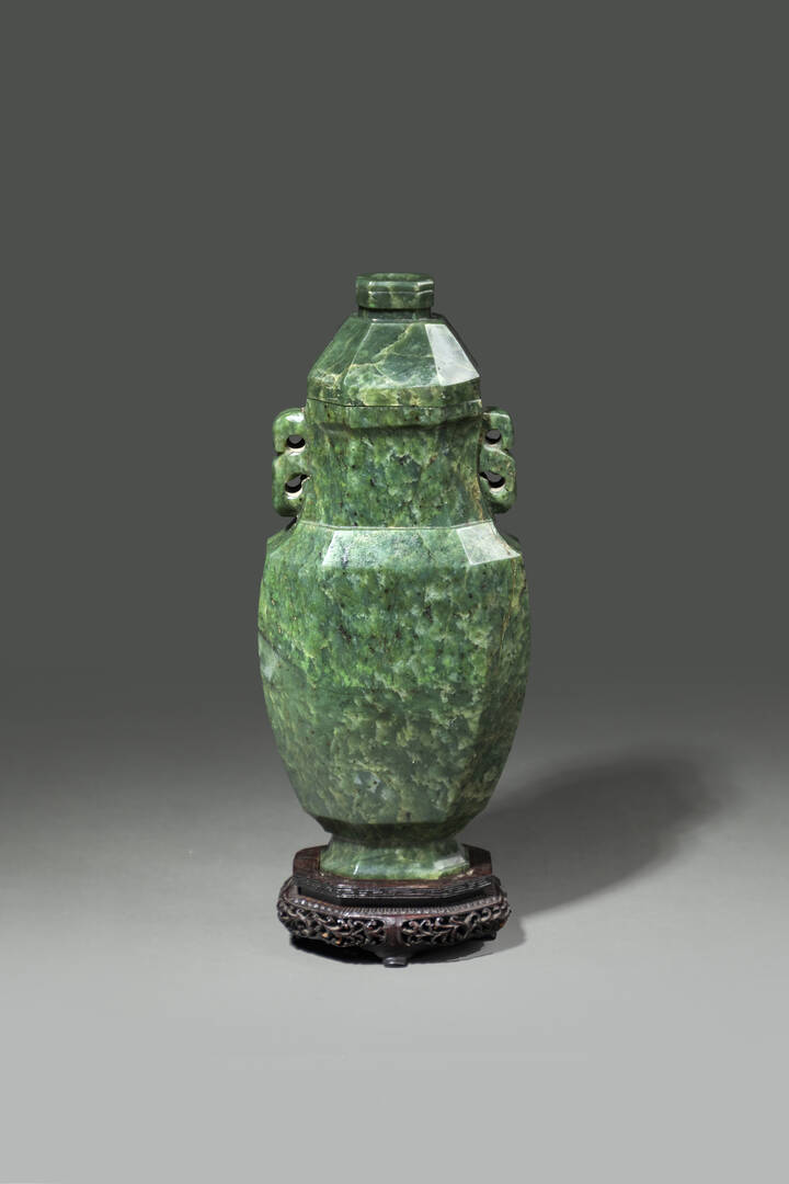 Vaso con coperchio a doppia ansa scolpito in giada spinacio, Cina, dinastia Qing, epoca Jiaqing (1769-1820)