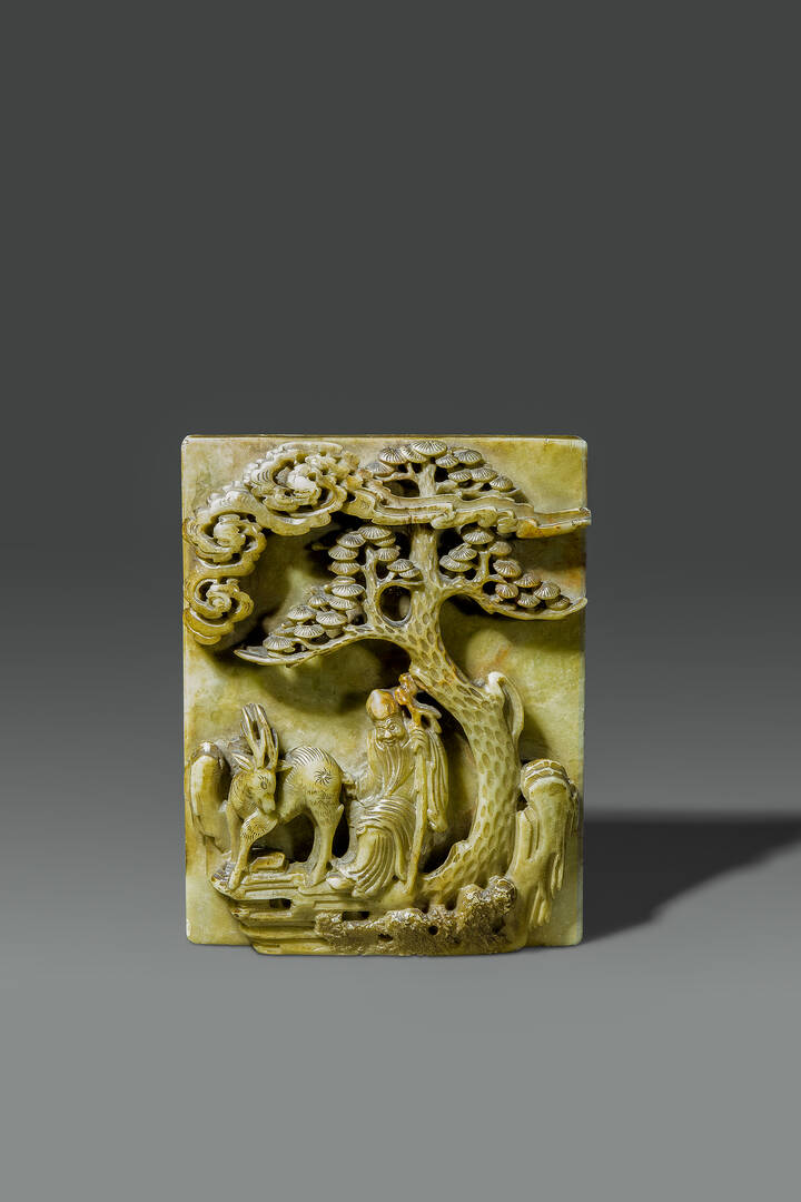 Placca scolpita in saponaria con figura di Shoulao entro paesaggio, Cina, dinastia Qing, epoca Jiaqing (1796-1820)