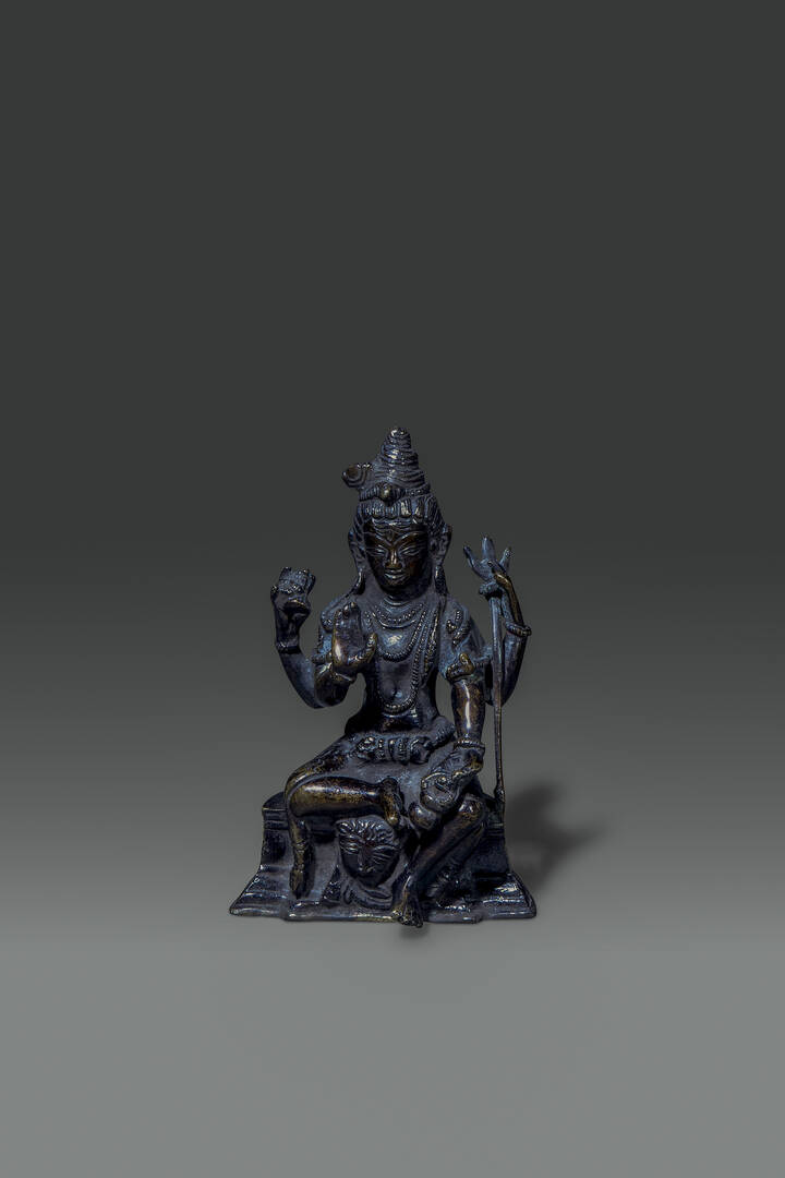 Figura di Amitaya in bronzo seduta su base decorata con figure di leoni a rilievo, Nepal, XVIII sec