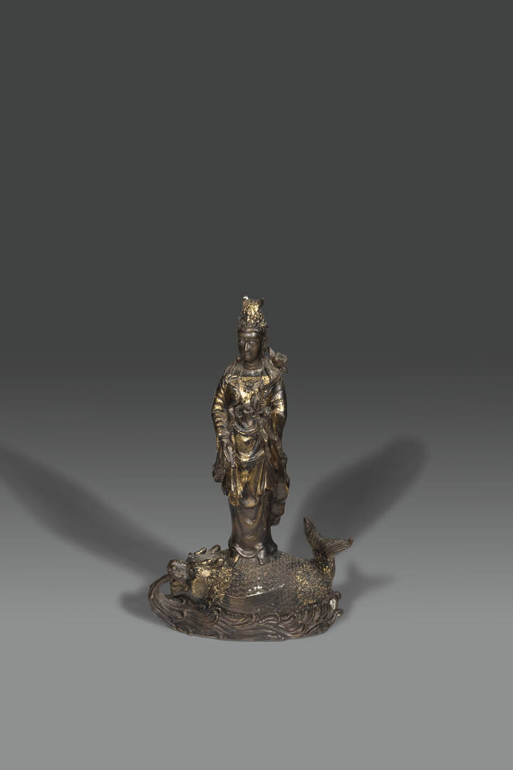 Scultura in bronzo rappresentante Guanyin in posizione eretta, su pesce con lumeggiature in oro, Giappone, XX sec