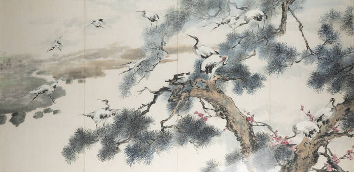 Dipinto su carta rintelata raffigurante gru su albero, Cina, dinastia Qing, XIX sec