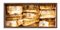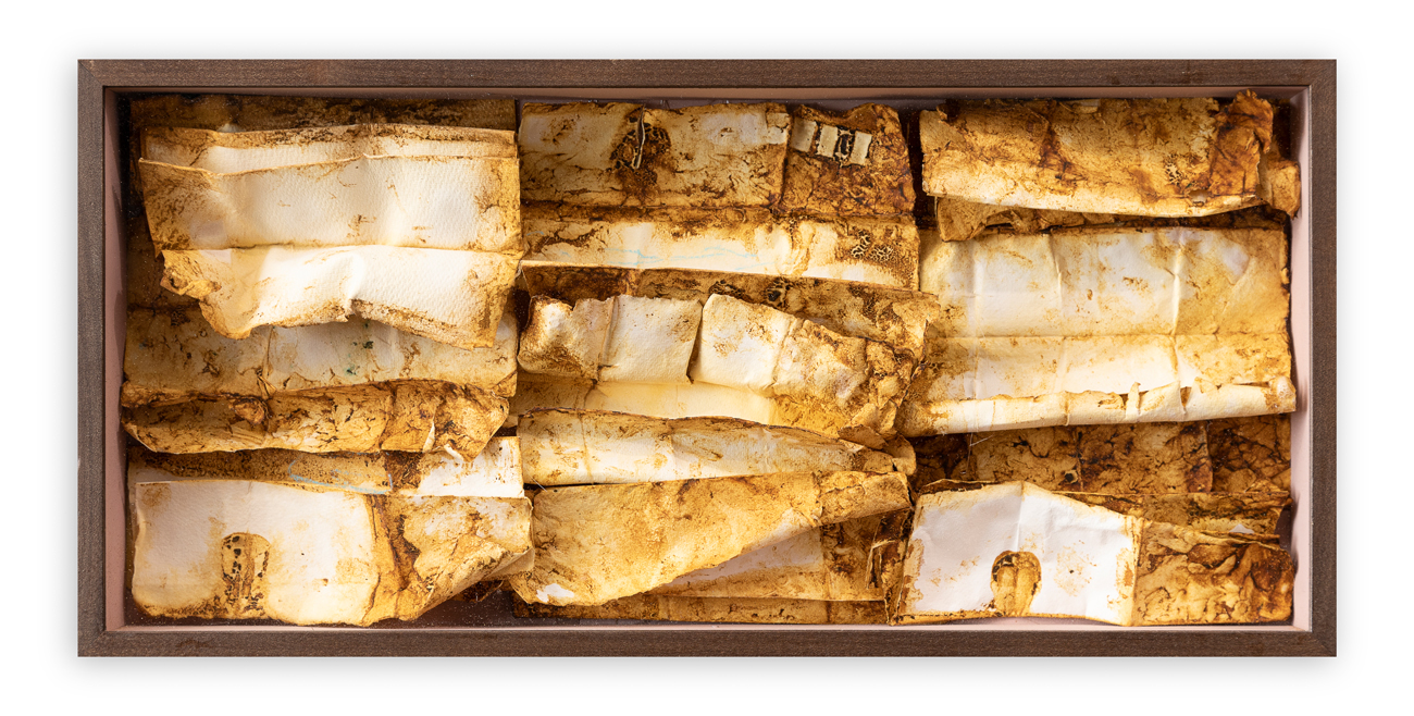 Asseblage di carte piegate e colorate entro box di legno e vetro