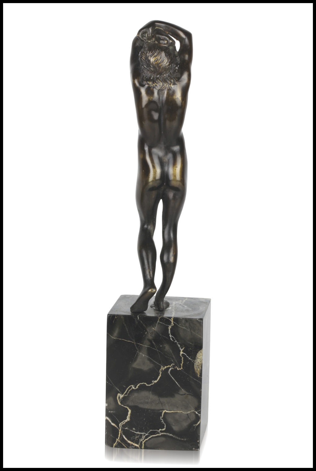 Si tratta di una bella fusione, dalla superficie molto lavorata e lucida, dotata di una splendida patina trasparente dai toni rossastri.