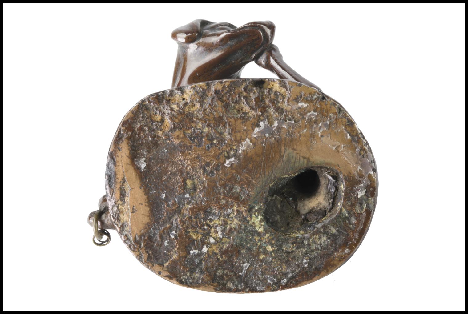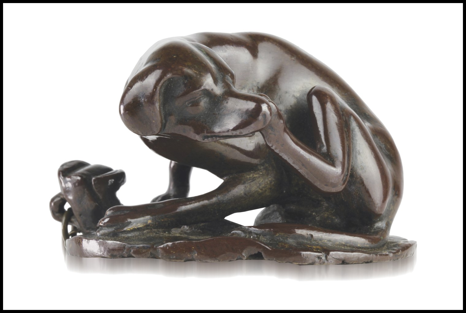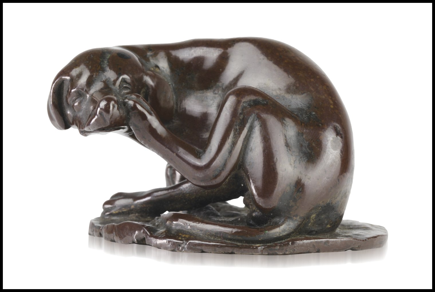 Questo incantevole bronzetto raffigura un cagnolino che si gratta l'orecchio, soggetto tratto da un' incisione del cosiddetto "Maestro del Libro di casa" (Germania, XVI secolo).