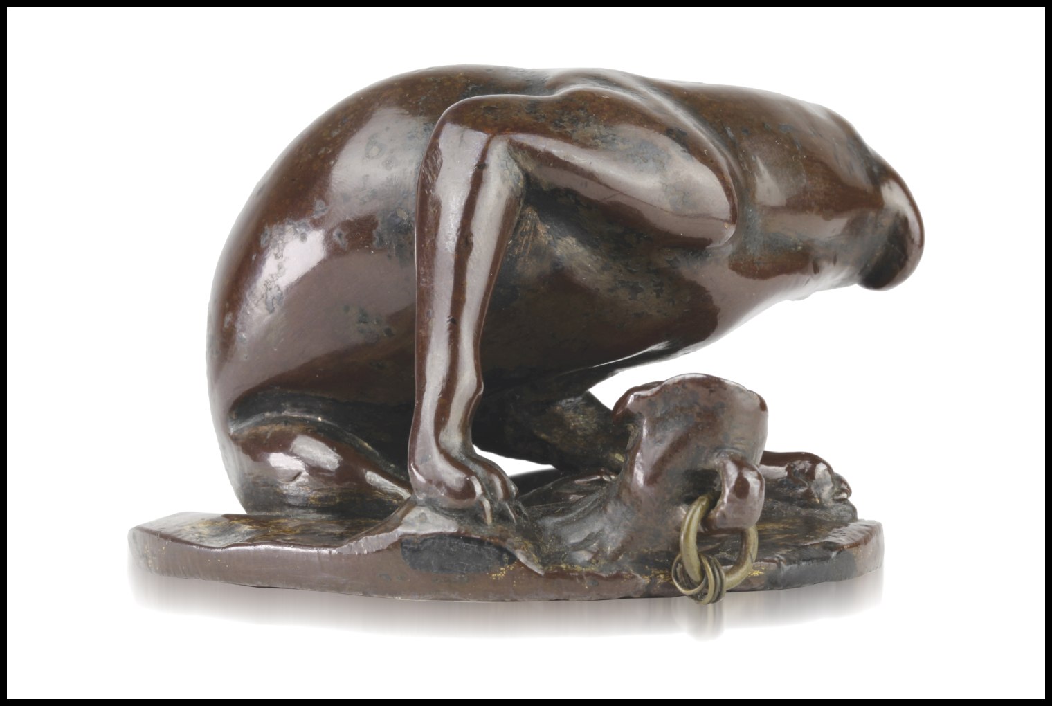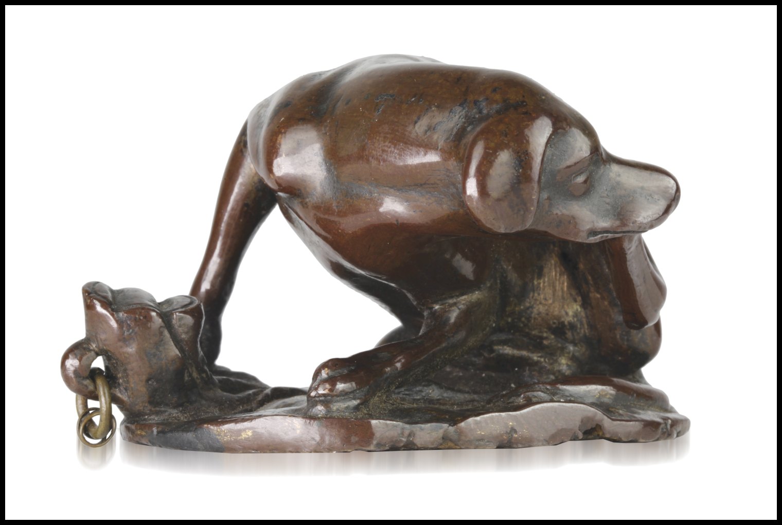 Il nostro bronzetto è una variante poggiante su una zolla erbosa con un tronco d'albero a cui il cagnolino era legato con una catena, ora persa.