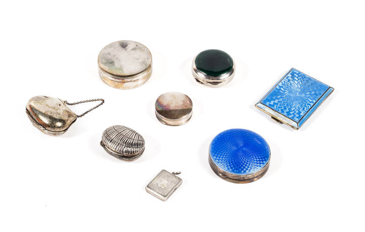 - tre porta pastiglie di forma rotonda e a conchiglia; uno in argento 925/1000. Peso complessivo gr 40,8