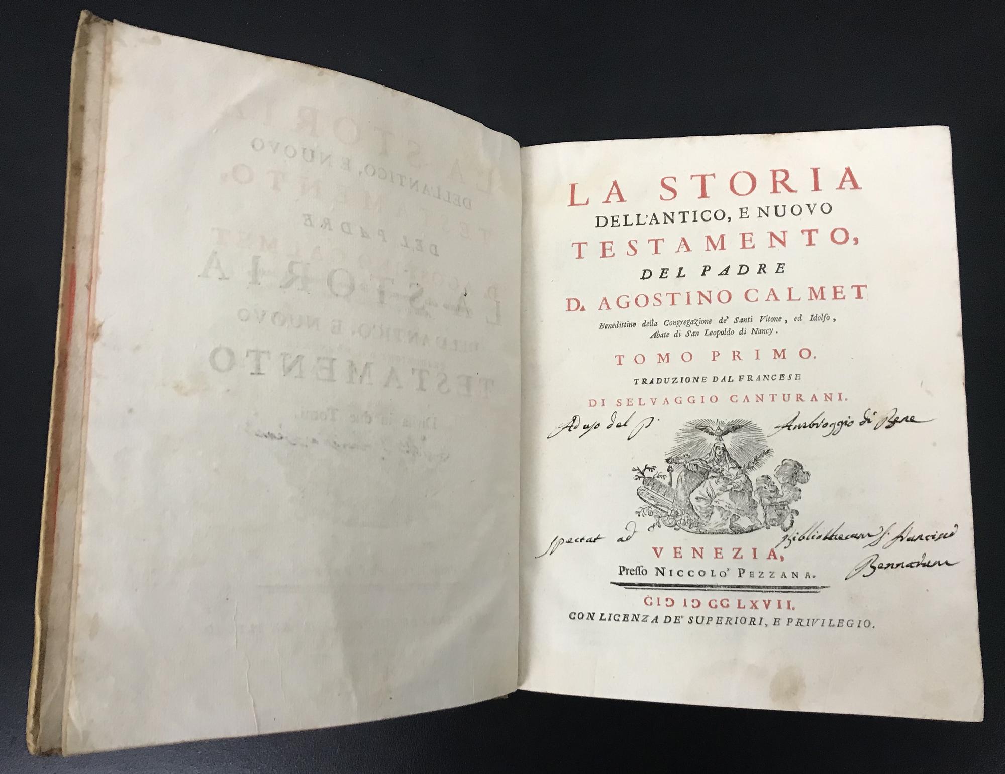 Agostino Calmet Benedettino della Congregazione De' Santi Vitone, ed Idolfo, Abate di San Leopoldo di Nancy. Traduzione dal francese di Selvaggio Canturani. Venezia Presso Niccolò Pezzana, 1767