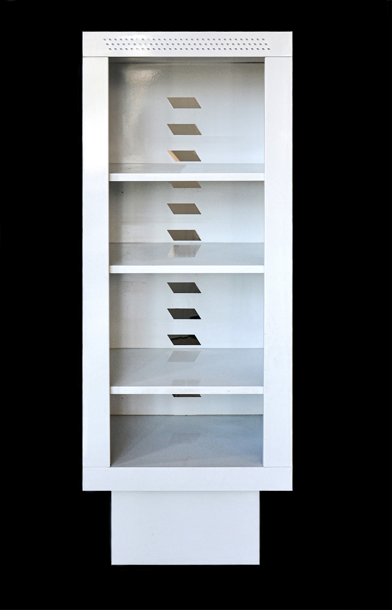 Cassa Phono Matteo Thun produzione Bieffeplast (PD) in lamiera verniciata grigio chiaro, mancano le staffe laterali per altoparlanti, testata con illuminazione.