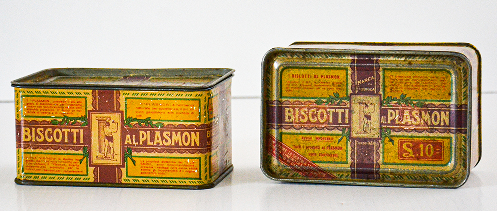 Lotto composto da n° 2 scatole di latta Biscotti al Plasmon, Milano anni' 50