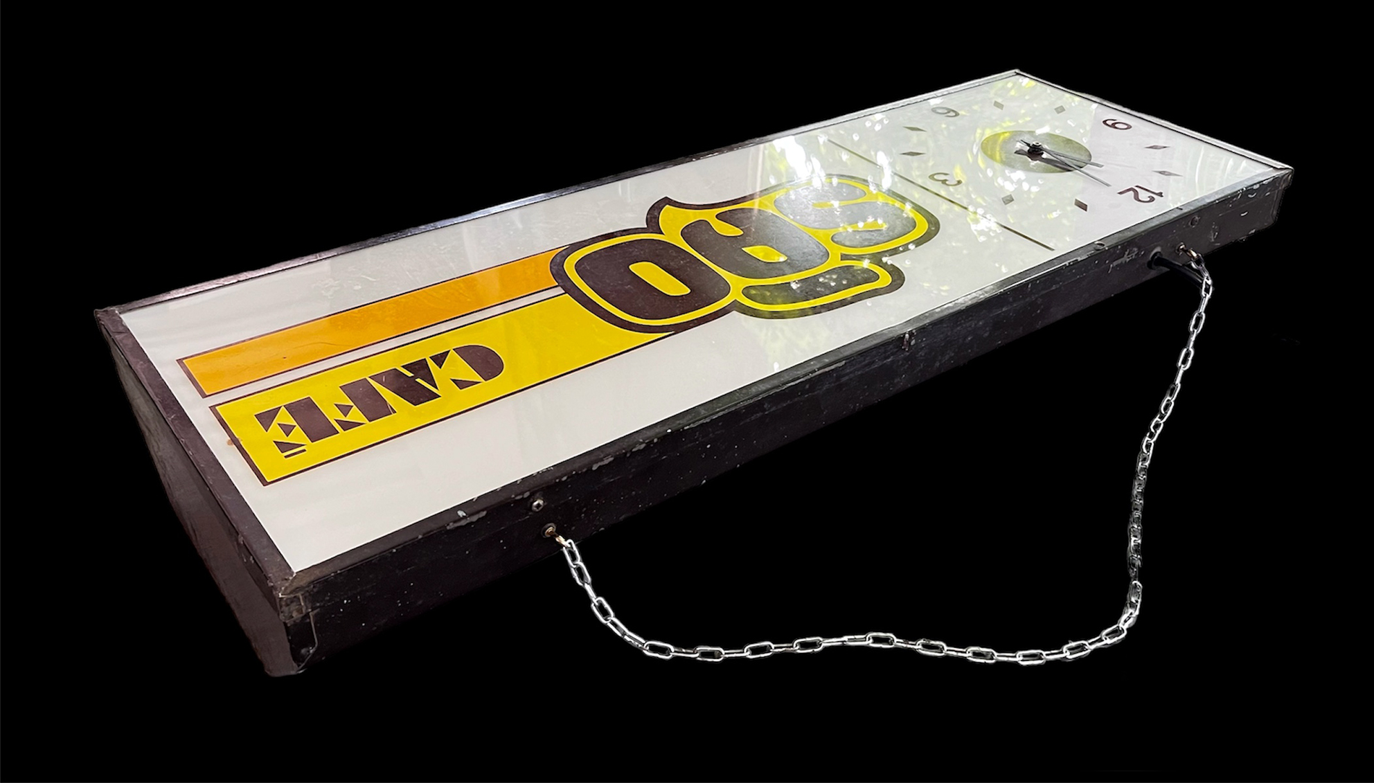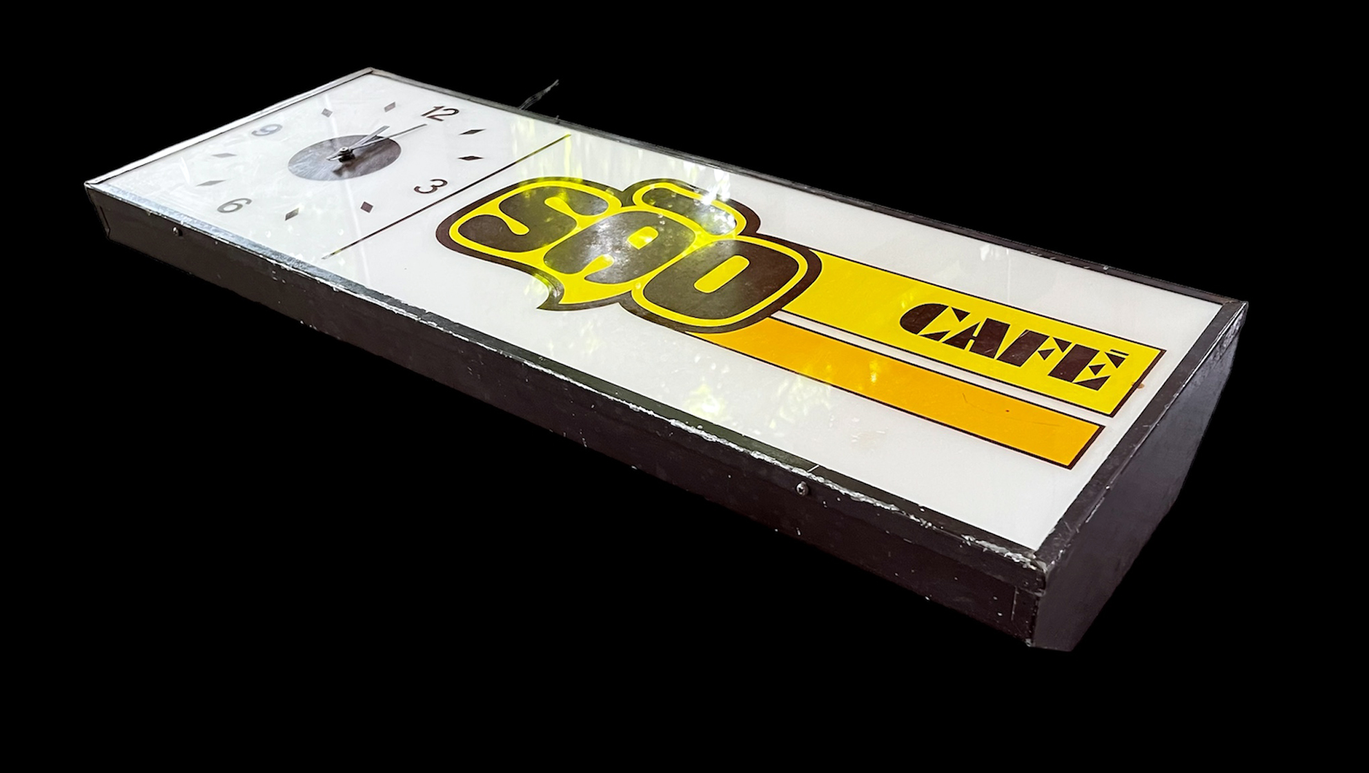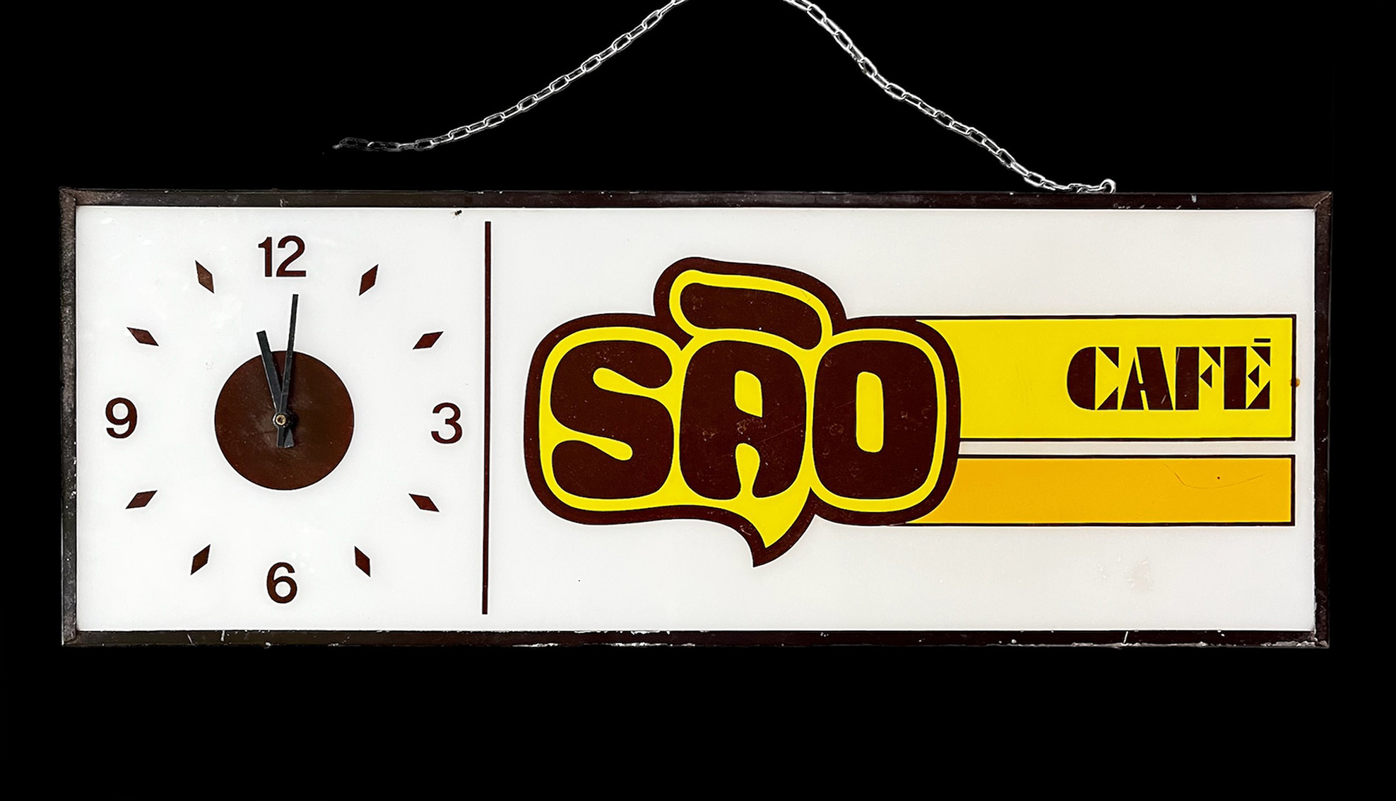 Insegna pubblicitaria luminosa con orologio Sào Café anni '70 con struttura in metallo