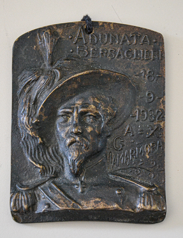 In bassorievo è rappresentato il volto di Lamarmora, fondatore del corpo Bersaglieri.