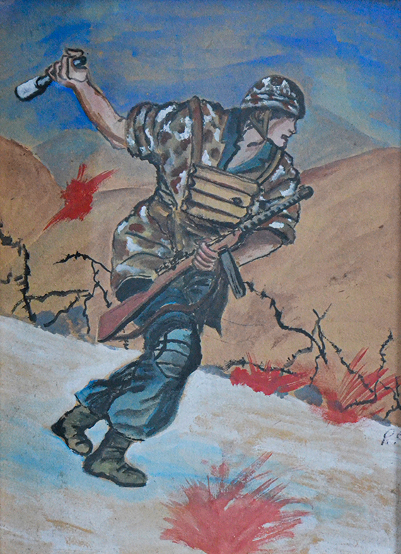 L'opera rappresenta un soldato in guerra nell'atto di lanciare una mina