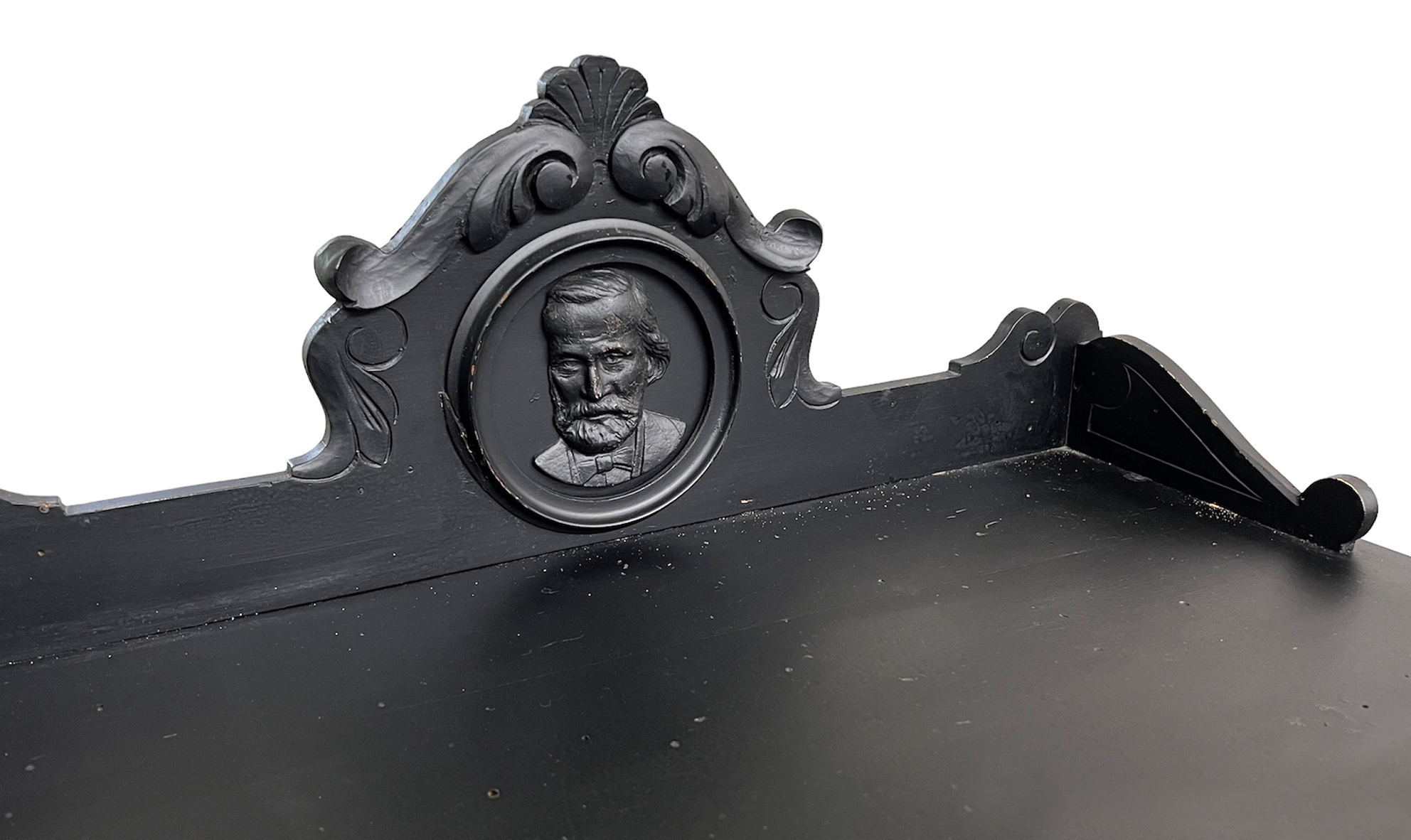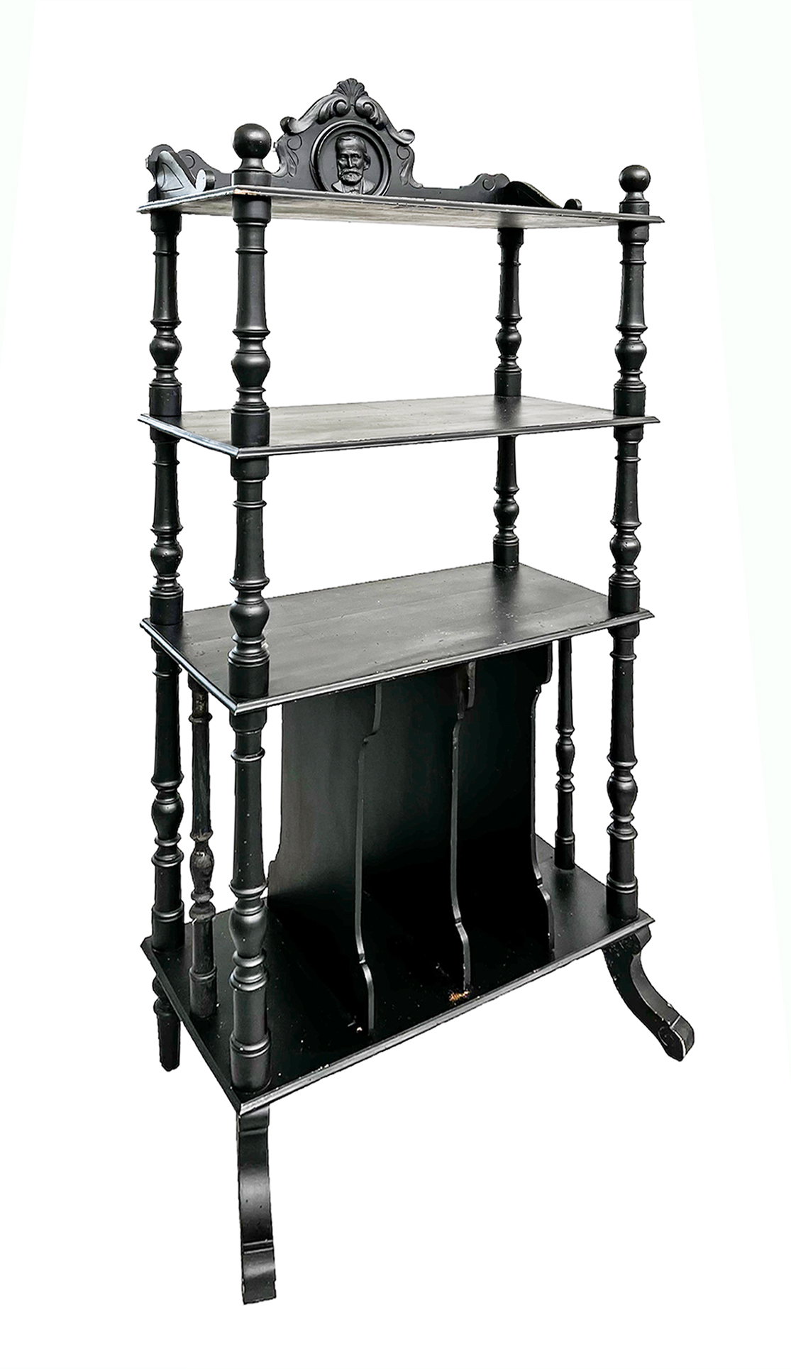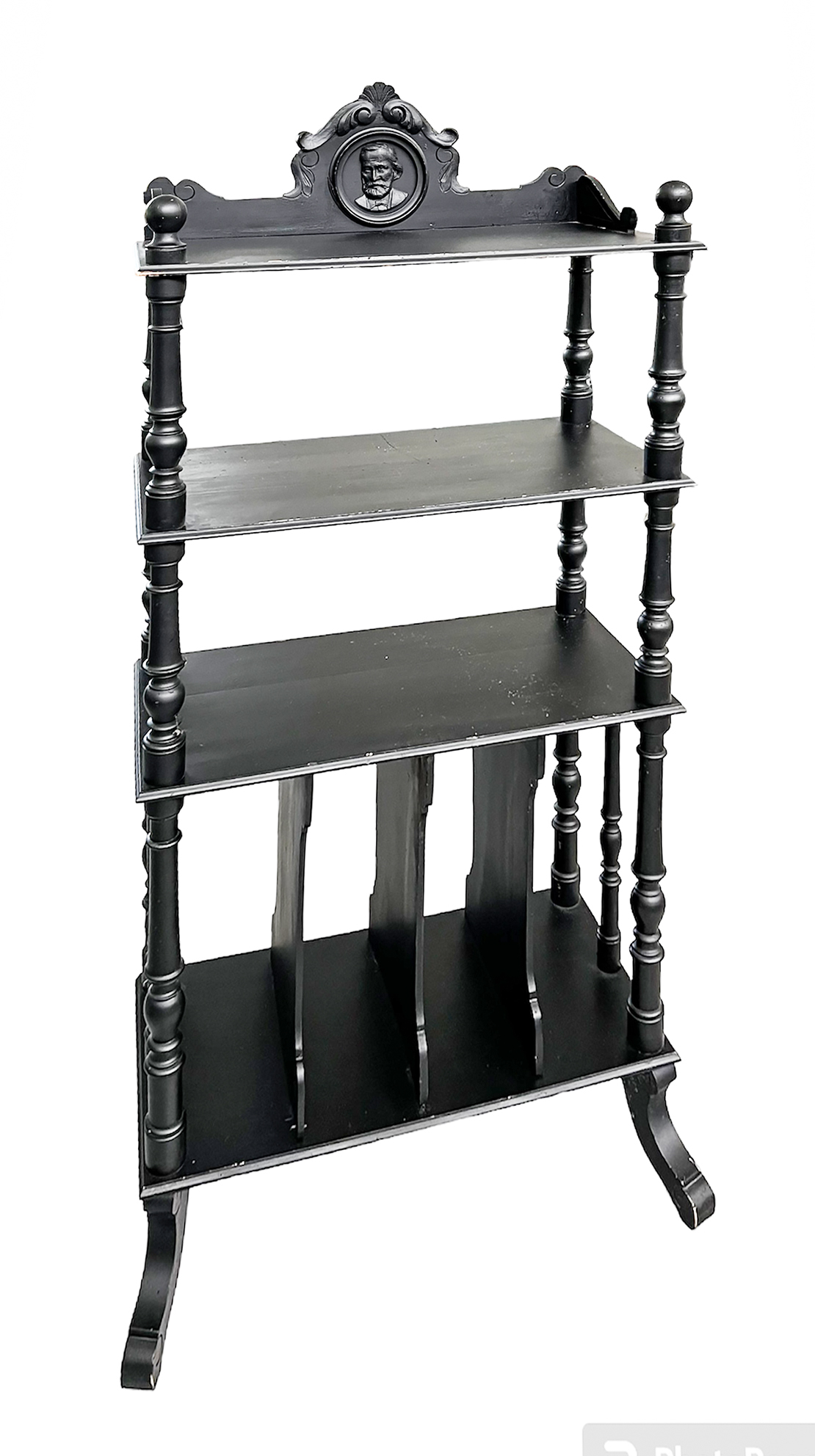 Etagere a colonne tornite con base porta spartiti e tre ripiani, cimasa arrichita con ritratto di Giuseppe Verdi.