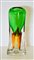 Vaso in cristallo trasparente con elementi sommersi di colore verde e ocra si presenta in una forma schiacciata nella parte inferiore e prominente nella parte superiore e dalla base ovale.