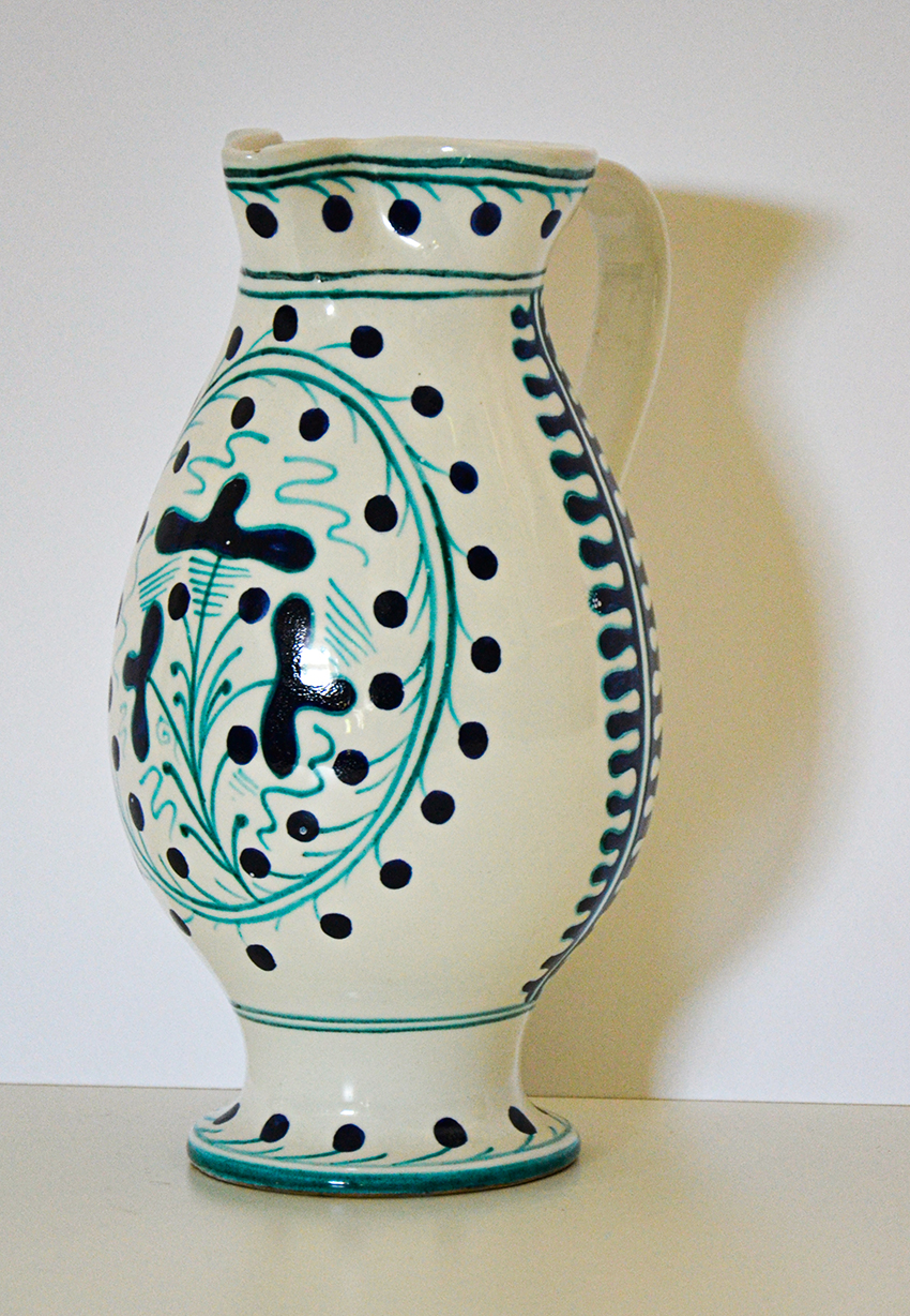 Anfora in ceramica smaltata con decorazione manuale nei toni del blu e del verde su fondo bianco