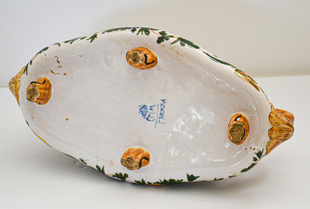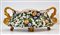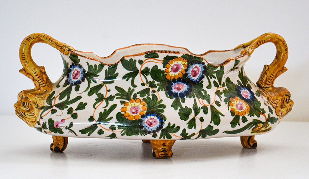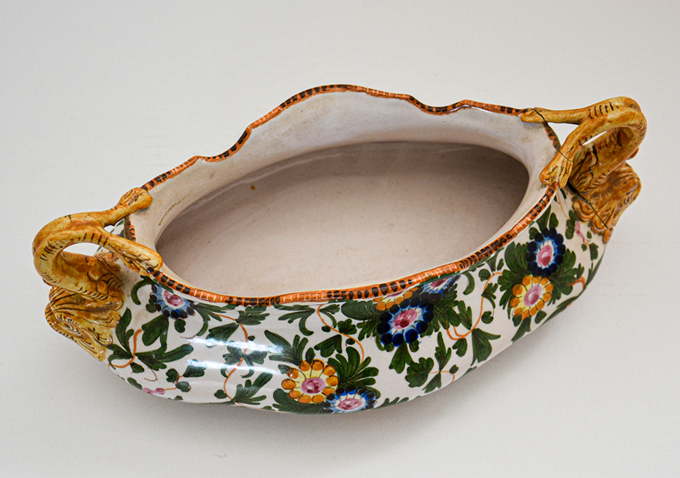 Centrotavola in ceramica policroma dipinta con decorazione a foglie verdi e fiori policromi, manici zoomorfi.