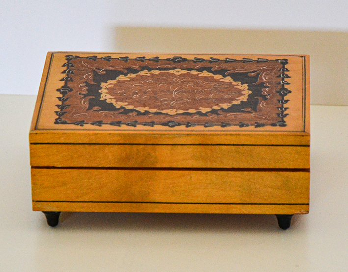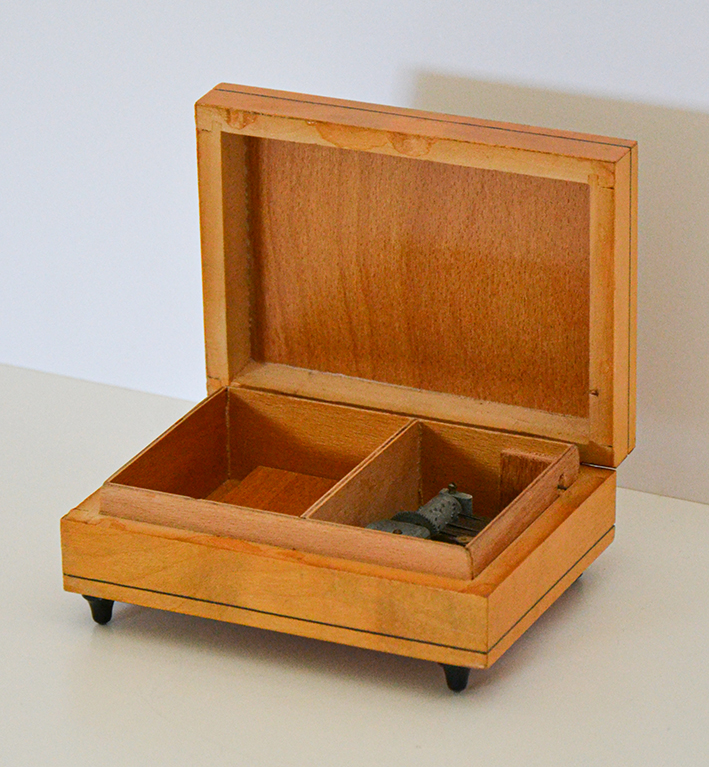 Scatola sorrentina in legno intarsiato con carillon, all'interno si presenta come una scatola portagioie con meccanismo a vista.