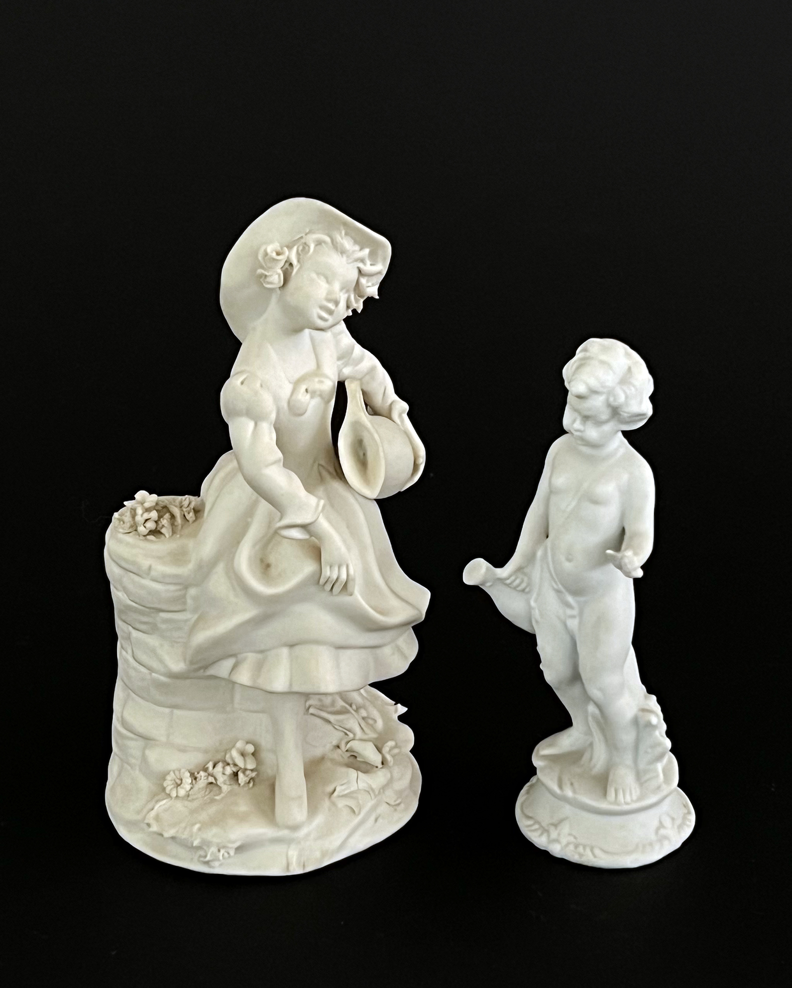 - Bambina in abiti ottocenteschi con anfora e fiori in bisque bianca.