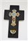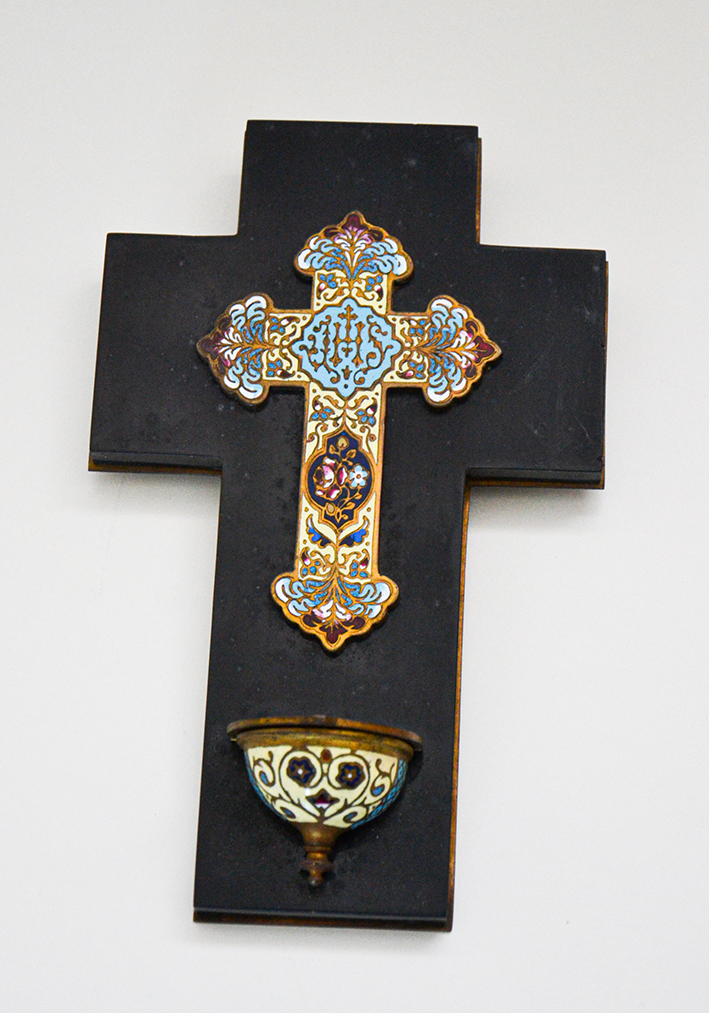 Acquasantiera in marmo nero con con croce e vaschetta lapidea in bronzo con decorazione cloisonné.