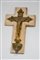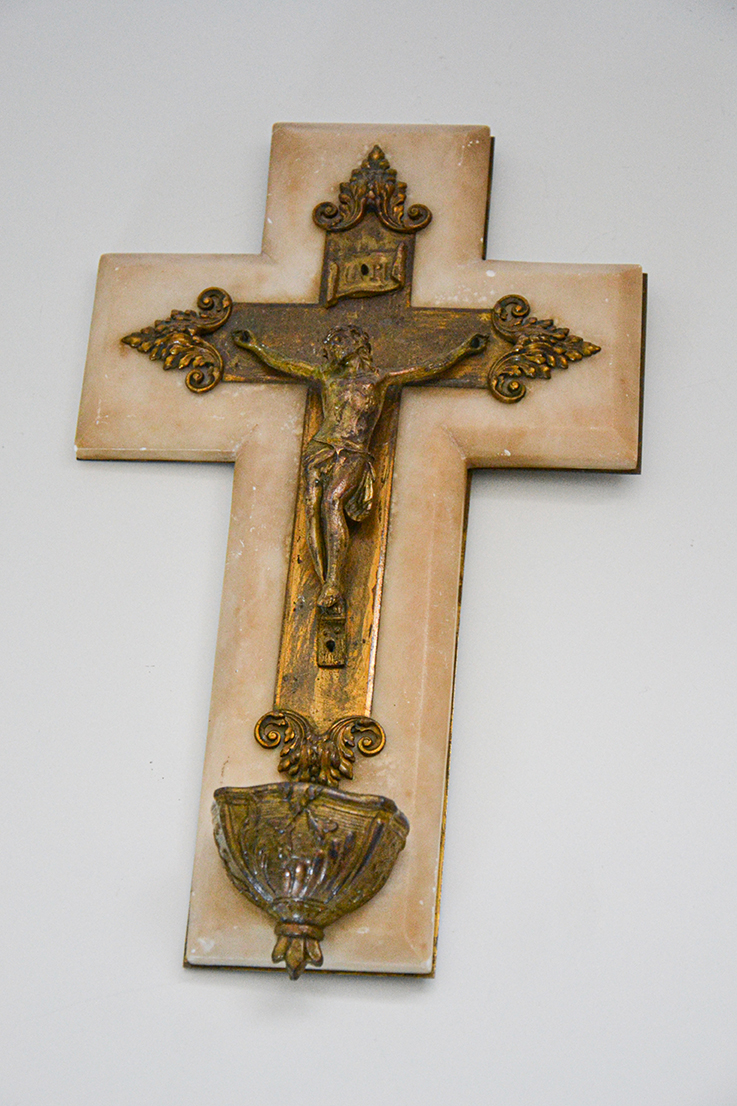Acquasantiera in marmo avorio con crocifisso e vaschetta lapidea in bronzo patina oro.