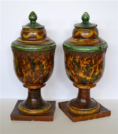 Lotto composto da una coppia di pinnacoli decorativi da giardino in terracotta smaltata policroma di ambito marchigiano.